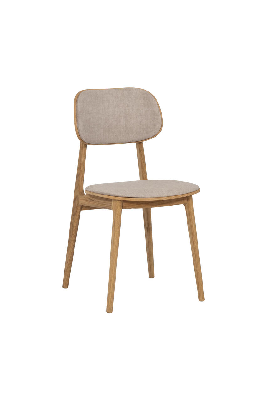 Solid wood chair with fabric covered seat and backrest.
