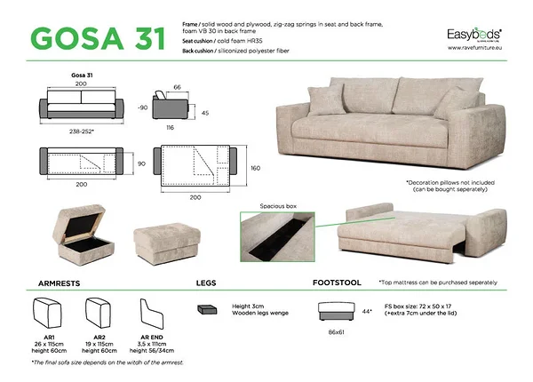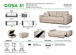 sofa bed series. Gosa frame is made of metal and plywood. Seat cushions are filled with cold foam HR. Back cushions with siliconized polyester fiber.