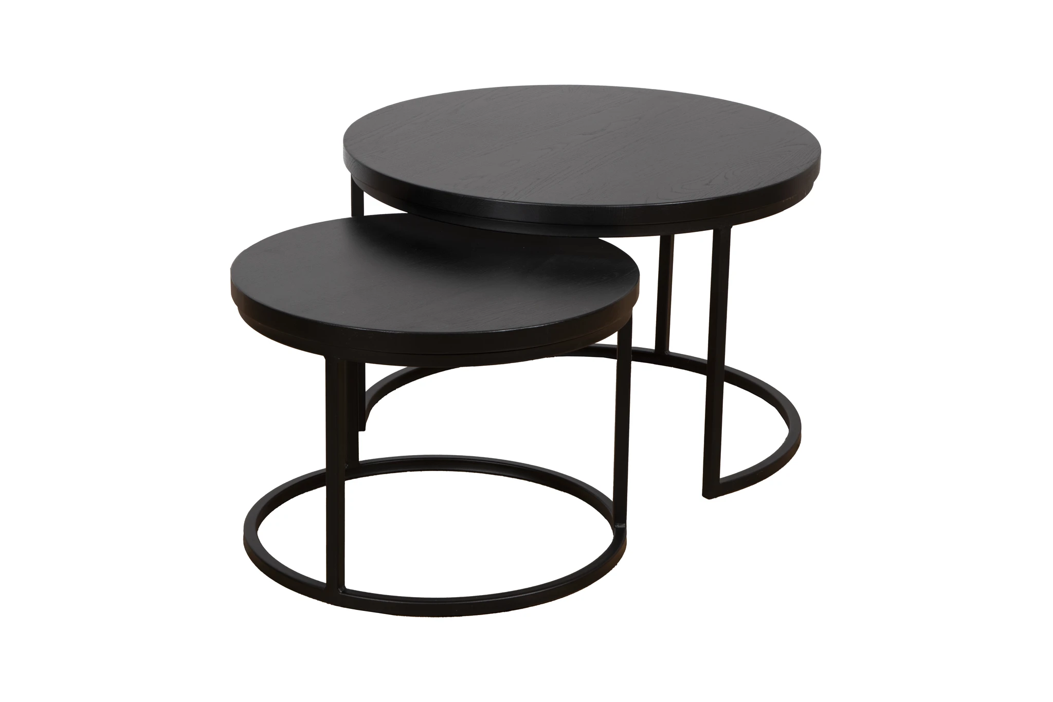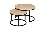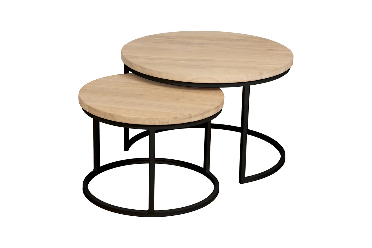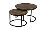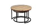 Beautiful coffee table set with solid wood table top and black metal frame.