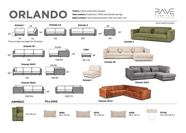 It´s a deep and low sofa with a floating effect. Orlando frame is made of solid wood and plywood.